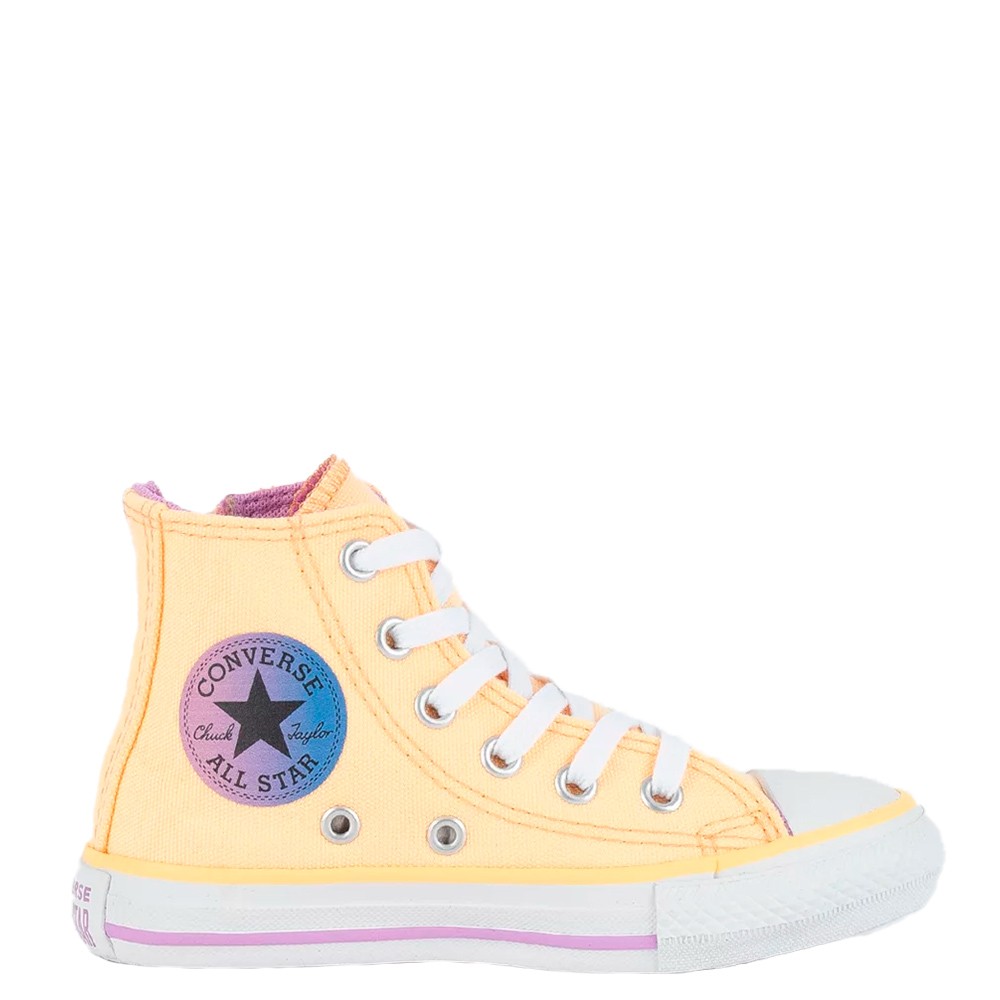 O clássico Chuck Taylor All Star na versão kids e em cores sazonais, é confeccionado em tecido canvas de algodão tipo lona, possui costuras duplas, uma tira de tecido no calcanhar que proporciona maior suporte ao tênis, forro interno acolchoado para maior conforto e dois ilhoses laterais para uma transpiração adequada aos pés. O Patch Logo com assinatura Converse Chuck Taylor All Star é aplicado na parte interna dos canos, enquanto o logo Converse All Star é aplicado na heeltab do calcanhar. O solado vulcanizado garante a aderência adequada ao caminhar.
